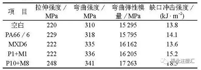 加入PA66/6的复合材料拉伸强度和缺口冲击强度高于加入MXD6的复合材料;加入MXD6的复合材料弯曲强度及模量高于加入PA66/6的复合材料,但未提高复合材料的缺口冲击强度。