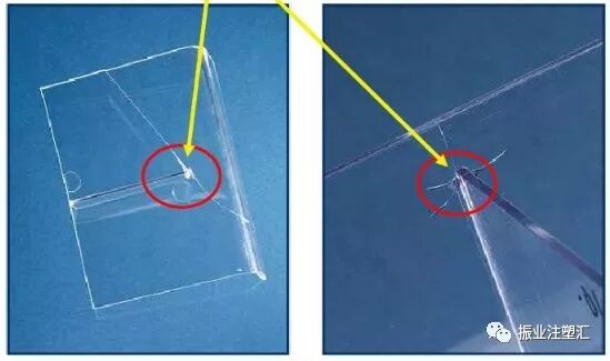 脱模推出时,由于脱模斜度小、模具型胶及凸模粗糙,使推出力过大,产生应力,有时甚至在推出杆周围产生白化或破裂现象。只要仔细观察龟裂产生的位置,即可确定原因。