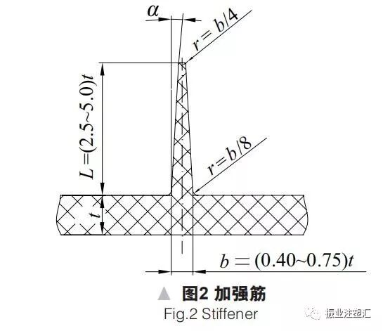 其中,b为加强筋厚度,t为壁厚,L为加强筋高度,α为脱模斜度。